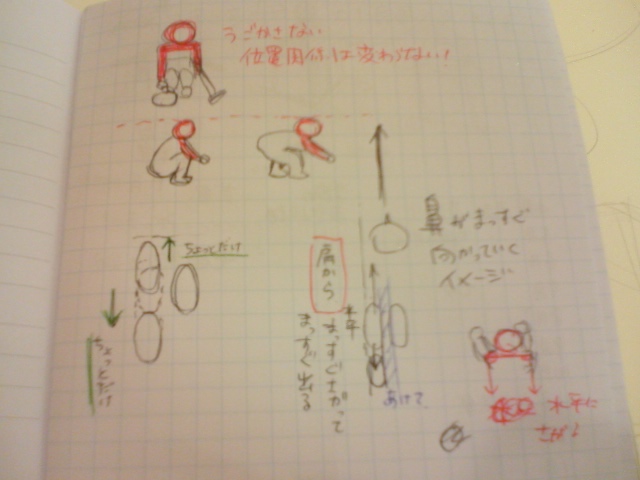 頭の位置と、左足をまっすぐ下げることと、右手をのばしすぎることなど教えてもらった。